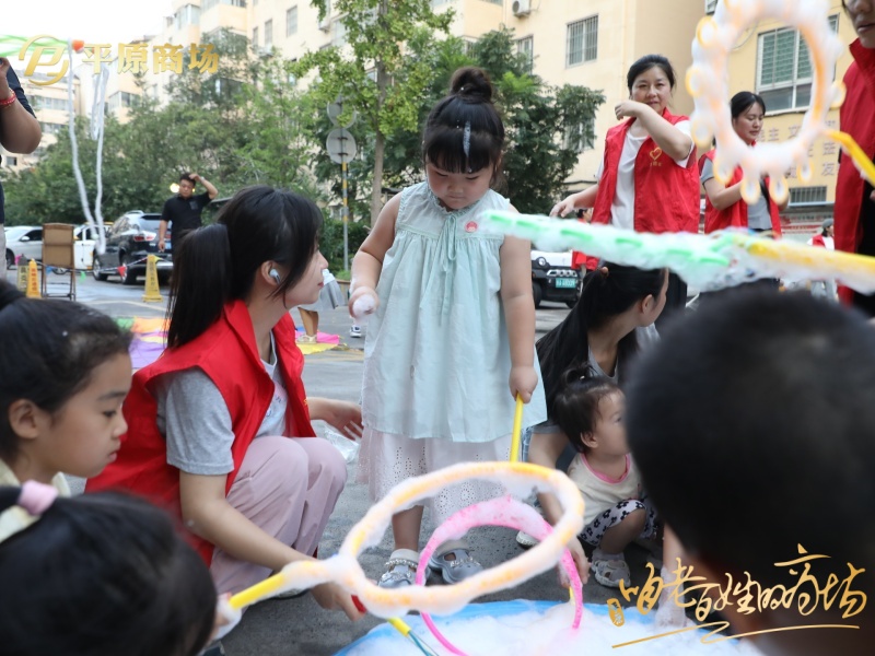 當(dāng)晚7時,活動一開始便點燃了小區(qū)廣場的熱情。彩虹傘展開的一瞬間便成為全場焦點,孩子們興奮地簇擁而上。清涼刺激的“水炸彈大戰(zhàn)”與如夢似幻的“魔法泡泡”體驗區(qū)成為了最火爆的親子樂園。小朋友們開心地追趕嬉戲,玩得不亦樂乎;家長們或參與其中,或駐足拍照;志愿者灌注的“水炸彈”更是供不應(yīng)求,忙忙碌碌間,頭頂?shù)暮怪楹蜑R濕的衣服混為一體,但看著孩子們純真的笑臉和興奮勁兒,他們便繼續(xù)彎腰灌注“水彈”,還開玩笑地說:“自己也是過童年了,把水一次玩夠。”