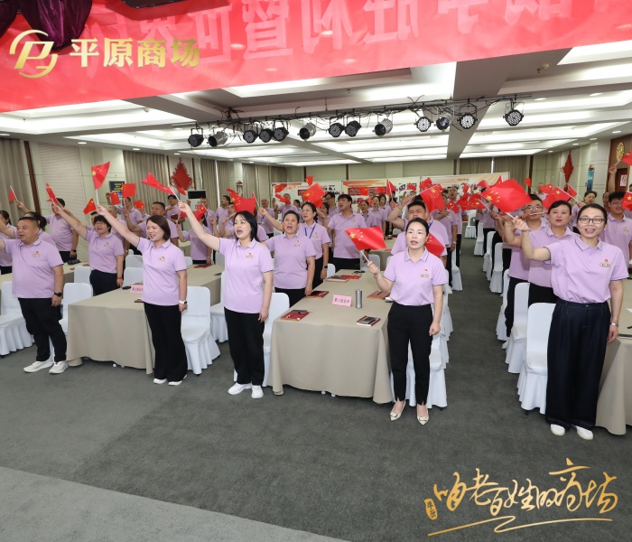 隨后,嘹亮的國(guó)歌響起,鮮紅的五星紅旗、平原商場(chǎng)店旗在全體員工的合唱聲中冉冉升起。大家齊唱《平原店歌》,高舉右拳莊嚴(yán)宣誓。國(guó)旗下、細(xì)雨中,誓言錚錚,映照初心、鼓舞干勁。